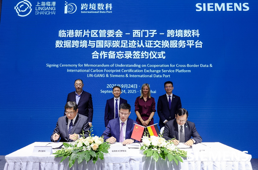 The Lin-gang Special Area Administration, German multinational corporation Siemens and the International Data Port signed a memorandum of understanding (MoU) on Sept 24 to jointly construct the Cross-Border Data & International Carbon Footprint Certification Exchange Service Platform. This marks a step forward by Lin-gang in promoting the deep integration of green and digital economies.