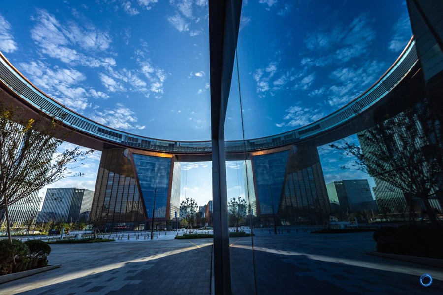 The modern architecture with its curved glass facade reflects the vast blue sky dotted with wispy clouds. [Photo/WeChat ID: gh_09971b51788a]