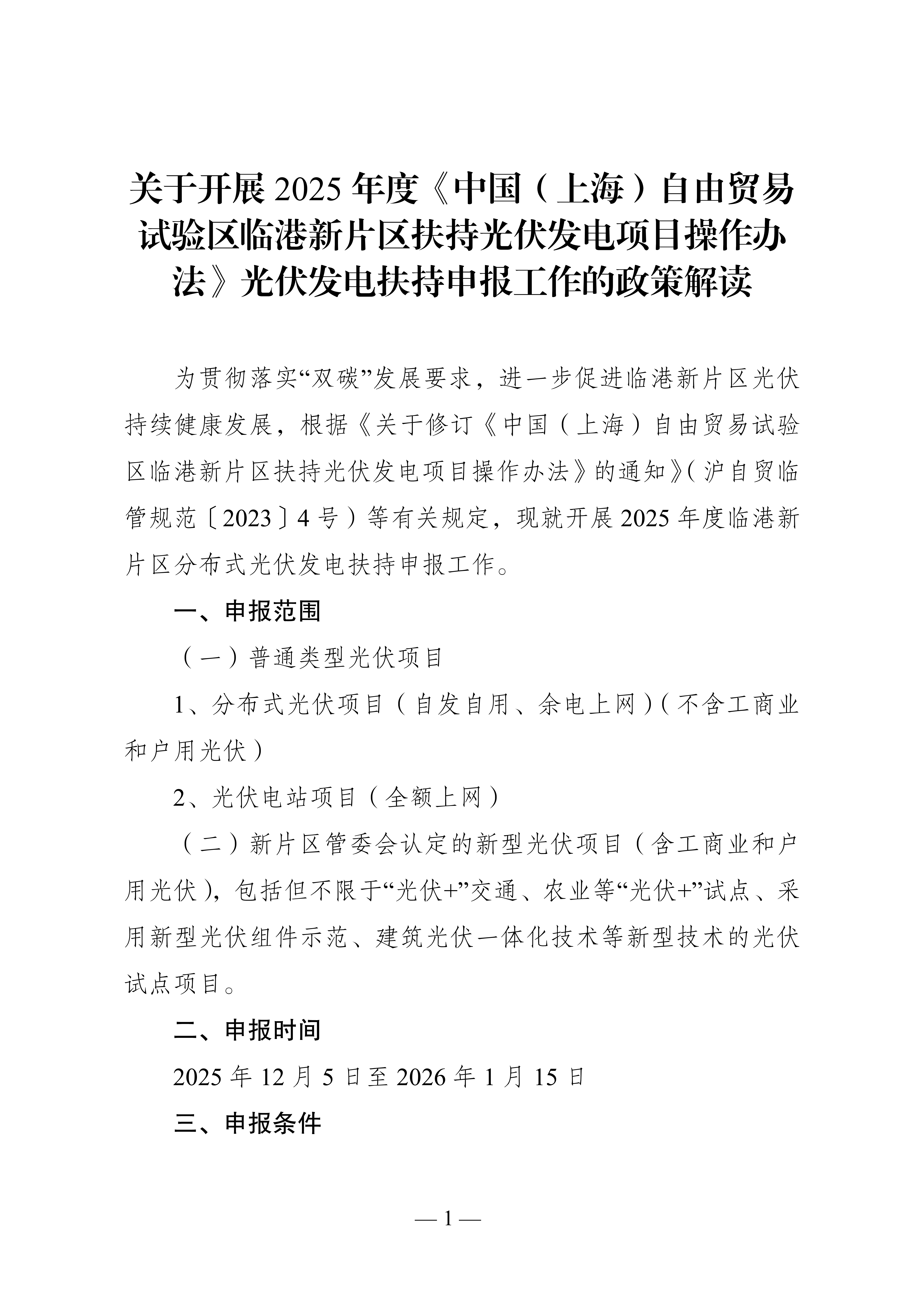 关于开展2025年临港新片区光伏发电扶持申报工作的政策解读