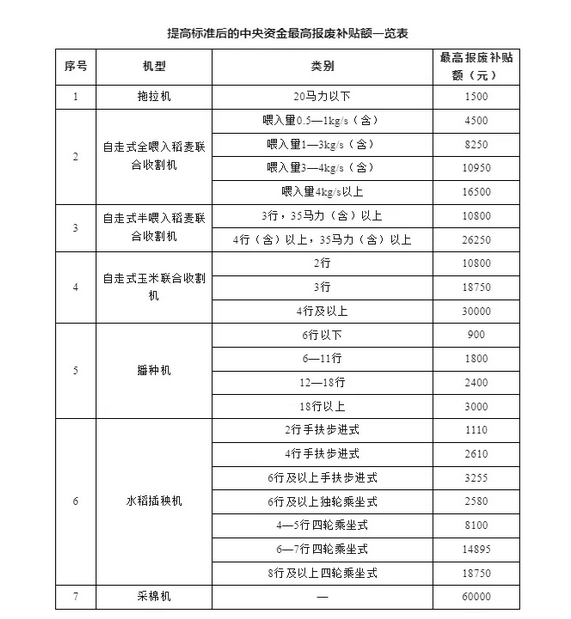 ● 报废联合收割机、水稻插秧机、播种机并新购置同种类机具,按不超过50%提高报废补贴标准,单台最高报废补贴额不超过3万元。