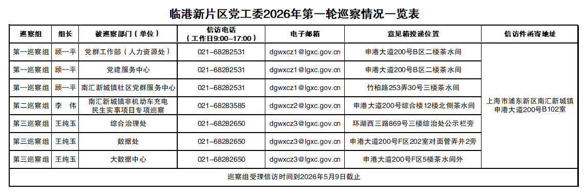 巡察期间,党工委巡察组设信访电话、专用邮箱和意见箱,主要受理反映被巡察党组织领导班子及其成员问题的信访举报,重点受理关于违反政治纪律、组织纪律、廉洁纪律、群众纪律、工作纪律和生活纪律等方面的举报和反映。其他不属于巡察受理范围的个人诉求、征地拆迁、涉法涉诉等问题,将按规定转交有关部门处理。本轮巡察受理信访时间到2026年5月9日截止。