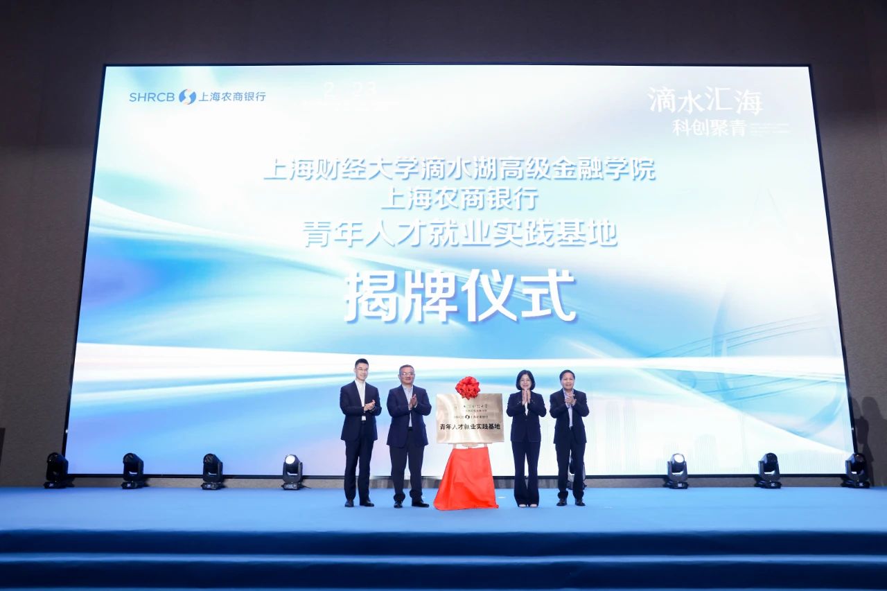 仪式现场,上海农商银行与上海财经大学共同揭牌“上海农商银行青年就业实践基地暨上海财经大学滴水湖高级金融学院”,将以助力青年人才培育为导向,以助力百姓美好生活为指引,加快建设宜业宜居的现代化滨海新城。