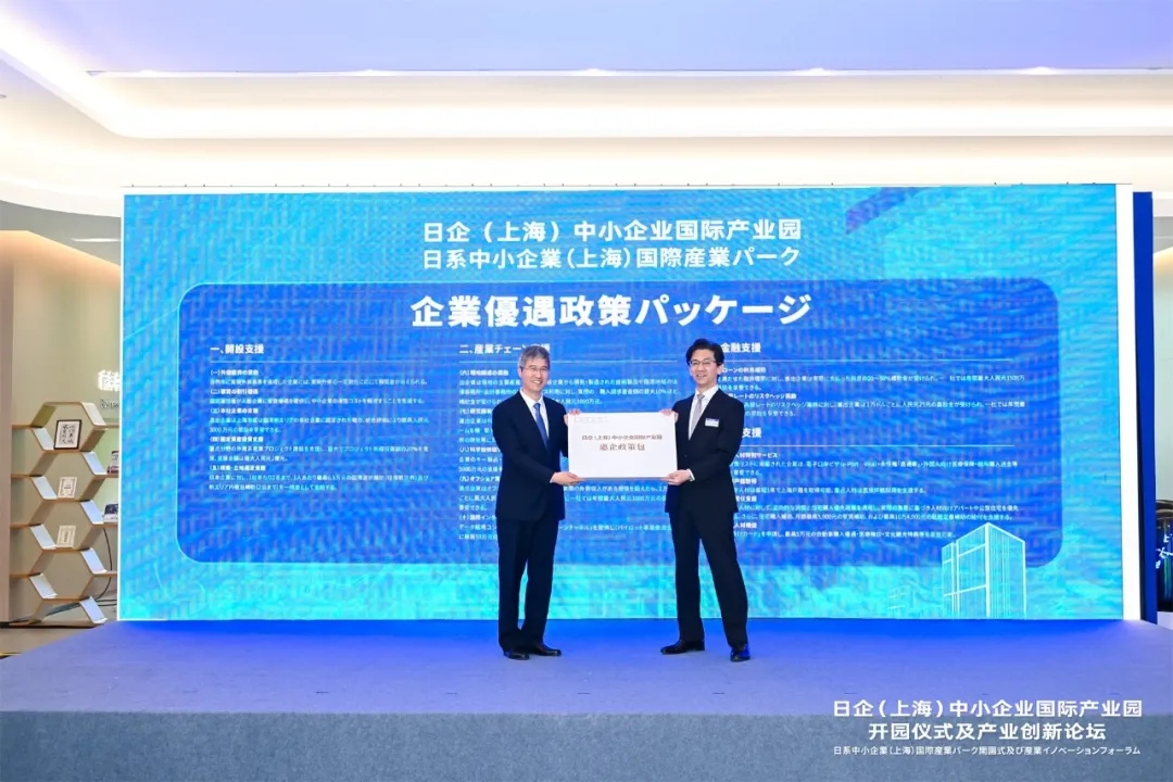临港新片区党工委委员、管委会常务副主任杨正伟为入驻企业代表发放日企产业园惠企政策包。日企产业园将充分发挥临港新片区的开放创新优势,为日资中小企业在中国市场的发展提供有力支撑。