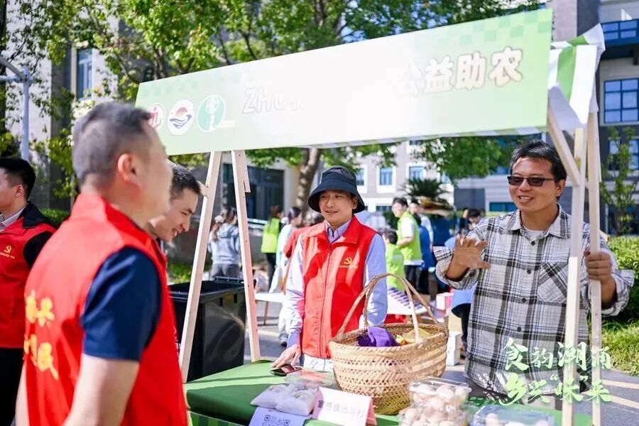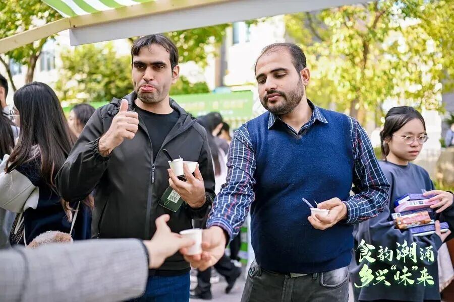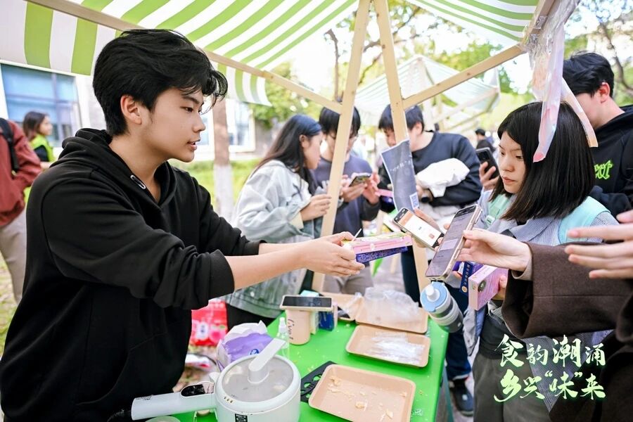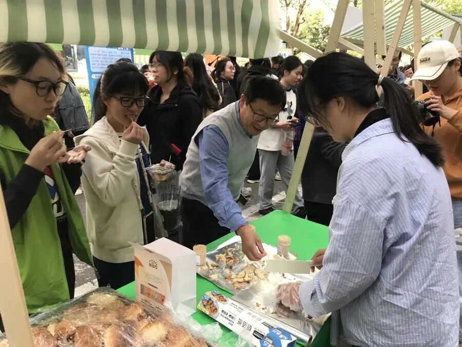 市集上,还展示了10余个校园科创项目:“鱼跃天山——探究不同解冻方式对新疆虹鳟鱼品质的影响及其预制菜产品开发”“海鱼马鲛鱼鱼松的开发及其在烘焙食品的应用”等,从实验室走向集市,呈现食品学科实力。“ZHU村情深,舌尖上的乡村振兴”特色环节上,金山区、浦东新区、崇明区驻村工作组也来到现场。来自四川、河南、贵州等地的锅盔、凉糕、米酒特色食品均供免费品尝,海大刘海泉教授团队用桑葚酿造的啤酒同样“管够”。