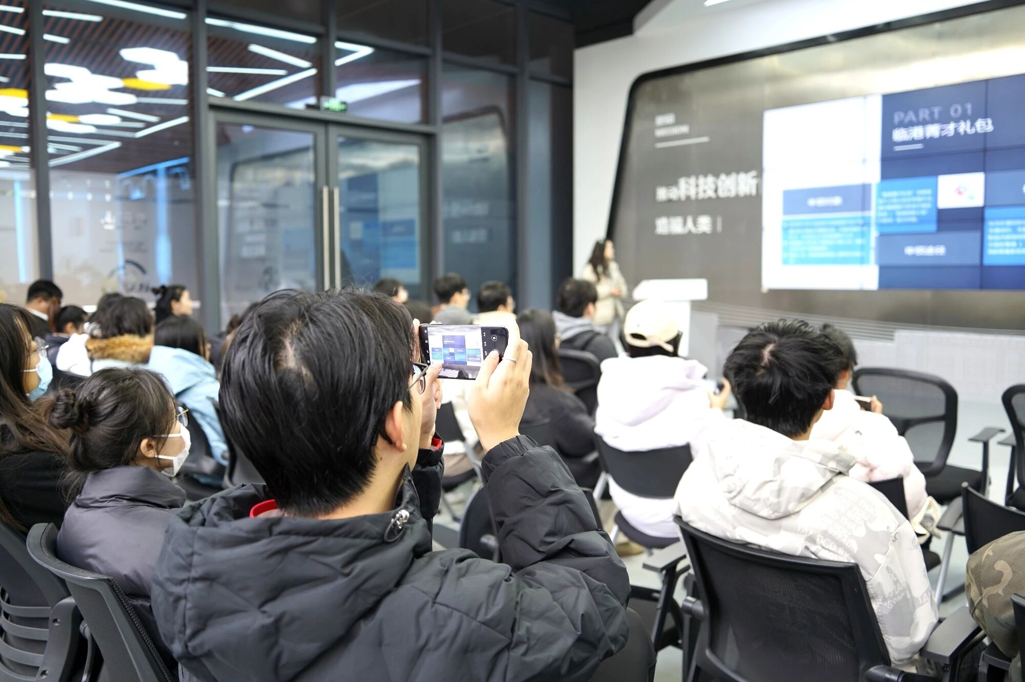 离开滴水云厅,实习生们走进临港新片区智能系统关键技术科技创新型平台。这里聚焦智能系统核心技术攻关,前沿的研发场景、浓厚的创新氛围,让大家直观感受到临港“科创之城”的硬核底气。探访间隙,专属临港新片区人才政策宣介会同步开启,临港新片区人才发展服务中心的老师为实习生们送上政策宣传手册,围绕“创客新政12条”展开深度解读,为大家清晰呈现留临发展的“人才政策大礼包”,互动环节围绕大家最关心的安家落户、各类补贴展开全方位讨论答疑。临港已为青年人才搭建起从实习到就业、从创业到安居的完整政策保障体系,全方位为大家的留临之路保驾护航。