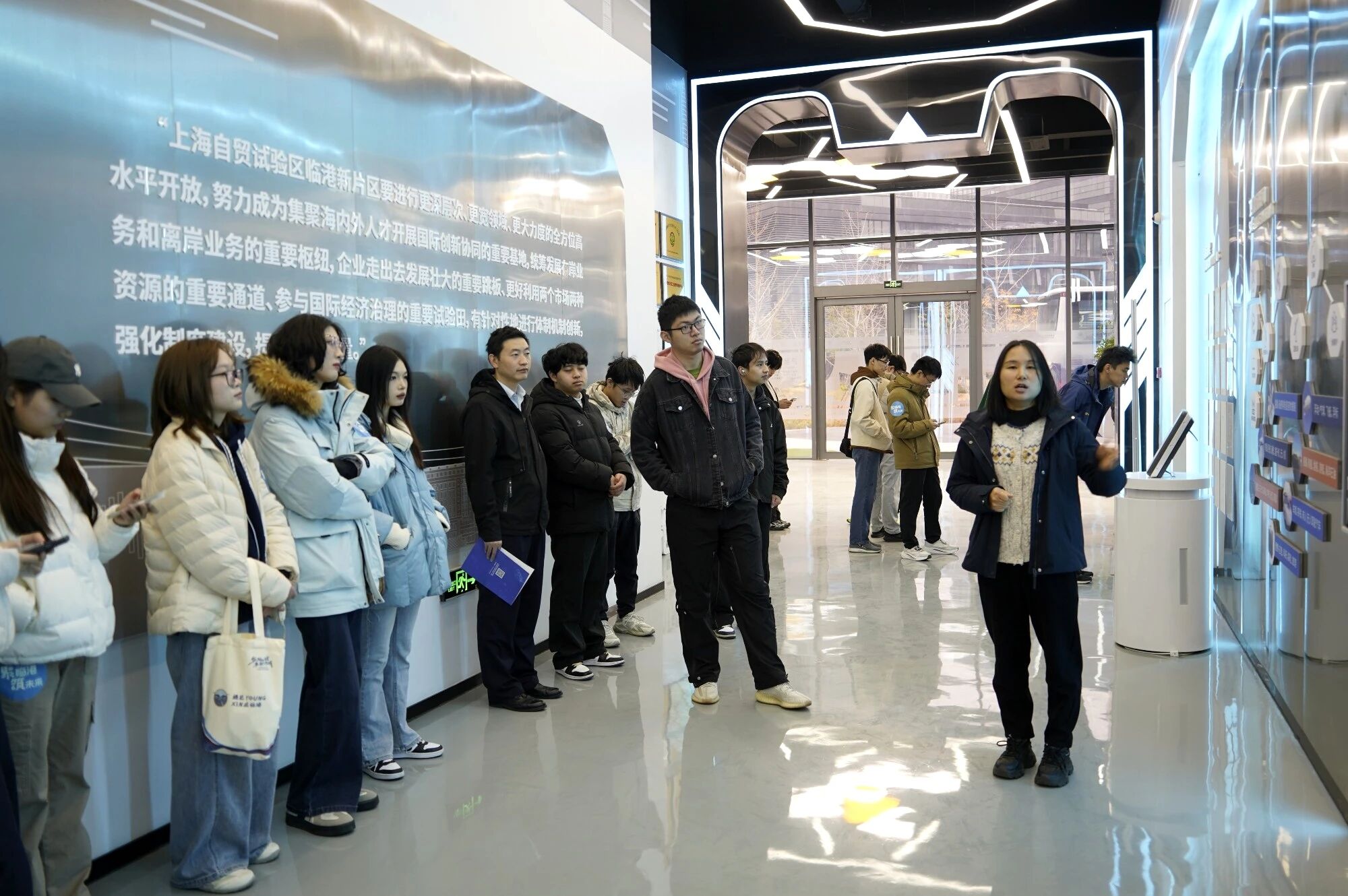 首站探访滴水云厅规划展示馆,科技感十足的沉浸式体验,让实习生们瞬间穿越到临港的产业未来。从新兴产业集群的精准落子,到未来产业的前瞻布局,一个个核心信息通过多元展陈形式清晰铺展,让每一颗年轻的心都备受激荡。大家纷纷表示,原来自己深耕的专业领域,在临港有着如此广阔的施展天地,一份扎根于此、逐梦前行的决心,也在心中悄然坚定。