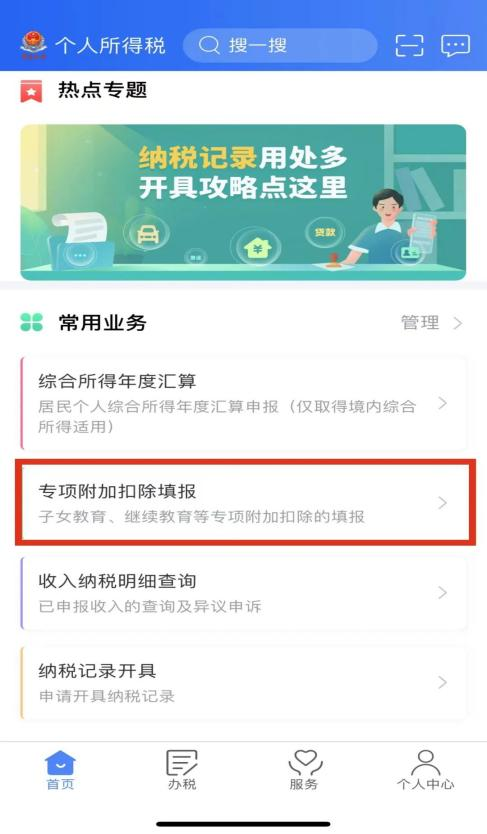 方式二:点击“常用业务”—“专项附加扣除填报”进入。