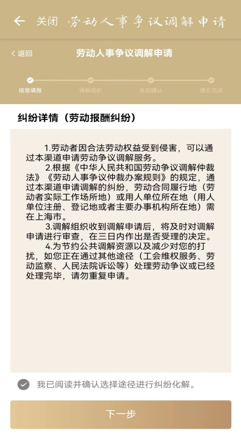在线申请劳动人事争议调解→进行【信息填报】→选择【调解组织】→收到【告知确认】→最后【完成提交】
