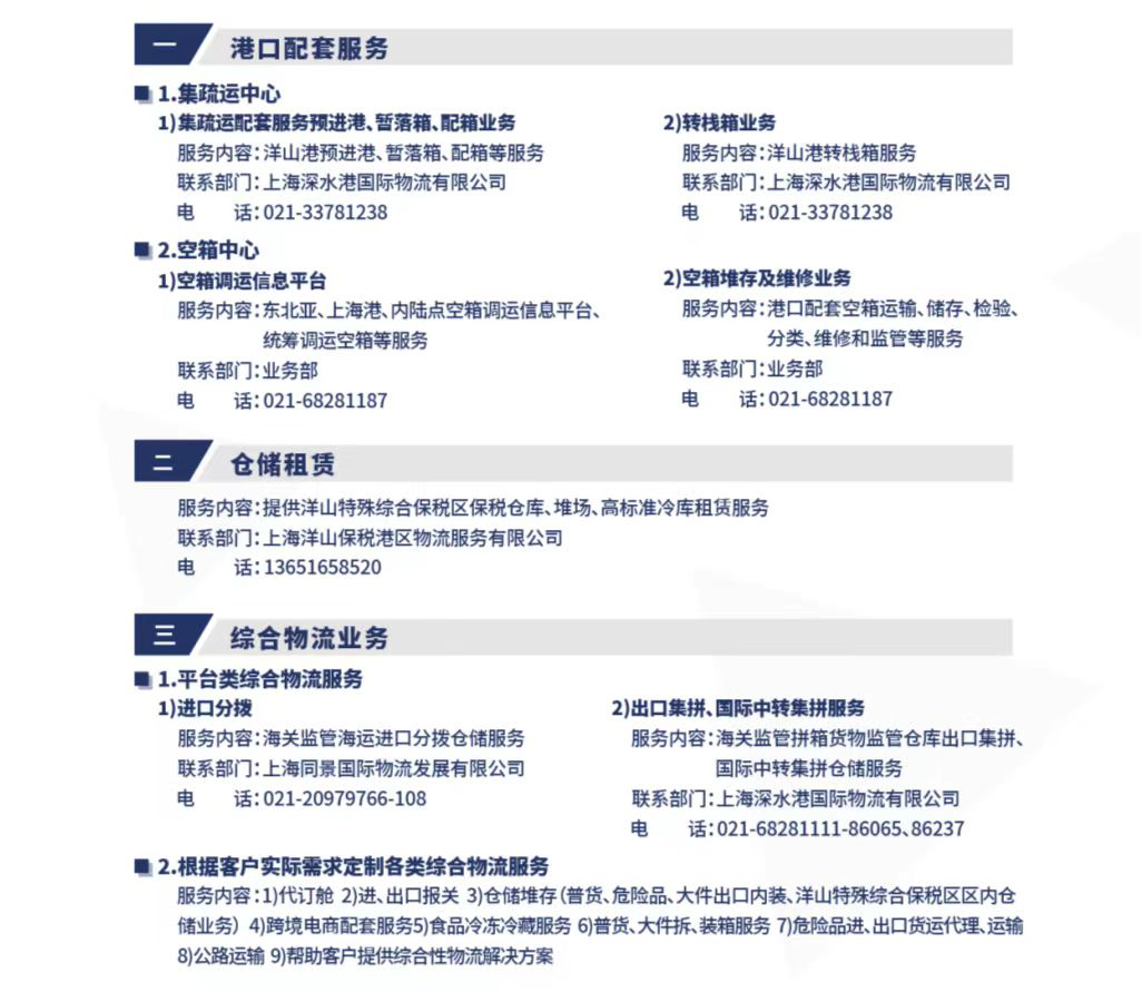 [主要业务] [港口配套] 上海港集疏运中心:洋山港区辅助堆场解决洋山港区堆场不足的问题;与洋山口岸集中查验中心协同运营共同致力于洋山港区的发展;削峰填谷提高东海大桥通行能力;打通集疏运体系堵点、打造服务创新高地、助推长三角港口经济高质量发展。
